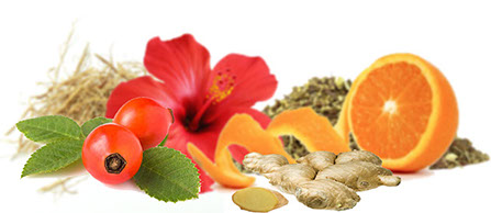 VETIVER . BLOOD ORANGE PEEL . LEMON GRASS . LILIKOI . PEPPERMINT ROSE HIPS . HIBISCUS FLOWERS . in SENCHA and BLACK TEA